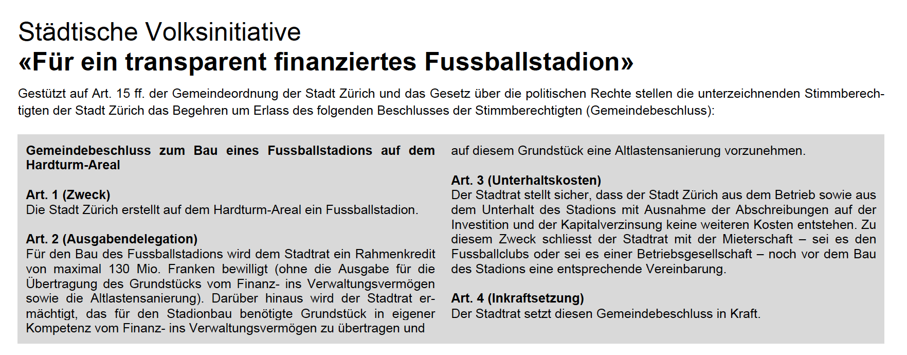 - Ohne die Luxus-Wohntürme fallen auch die bereits angekündigten Einsprachen weg. Mit unserer Initiative kommt Zürich also sogar schneller zu einem Fussballstadion. Das Ziel: Spatenstich Ende 2022.